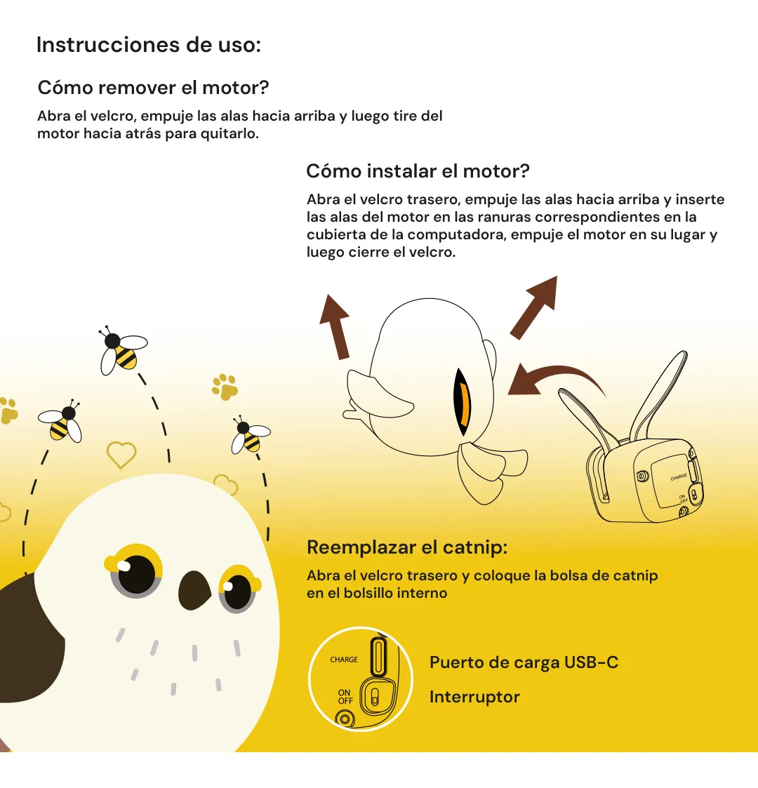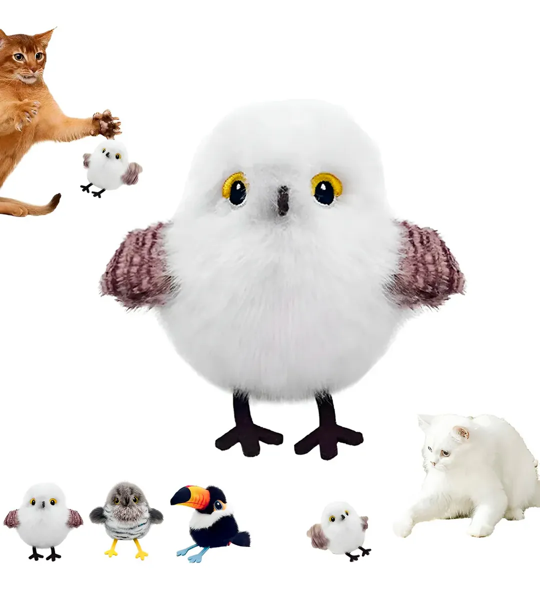 Este juguete interactivo con forma de ave está diseñado para estimular el instinto natural de caza de tu gato mediante un movimiento de aleteo realista e impredecible. Las alas se mueven en ráfagas cortas, con pausas y cambios de ritmo, imitando el comportamiento natural de un ave intentando escapar y manteniendo al gato atento por más tiempo.